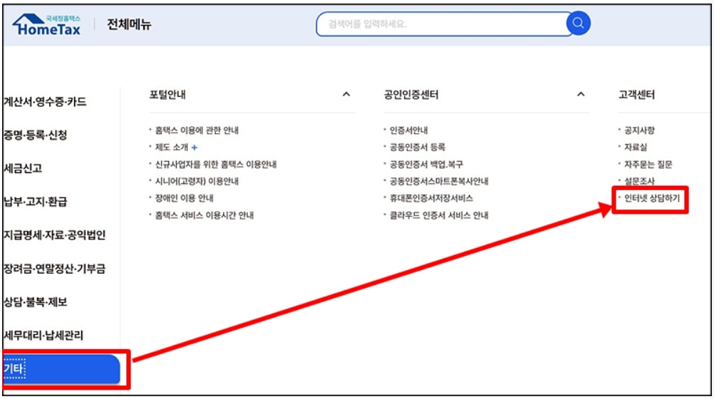 1. 홈텍스 > 기타 > 고객센터에서 인터넷 상담