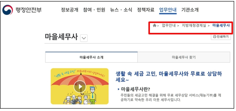 내 지역에 가까운 마을세무사는 행정안전부 누리집을 통해 찾아보면 됩니다.