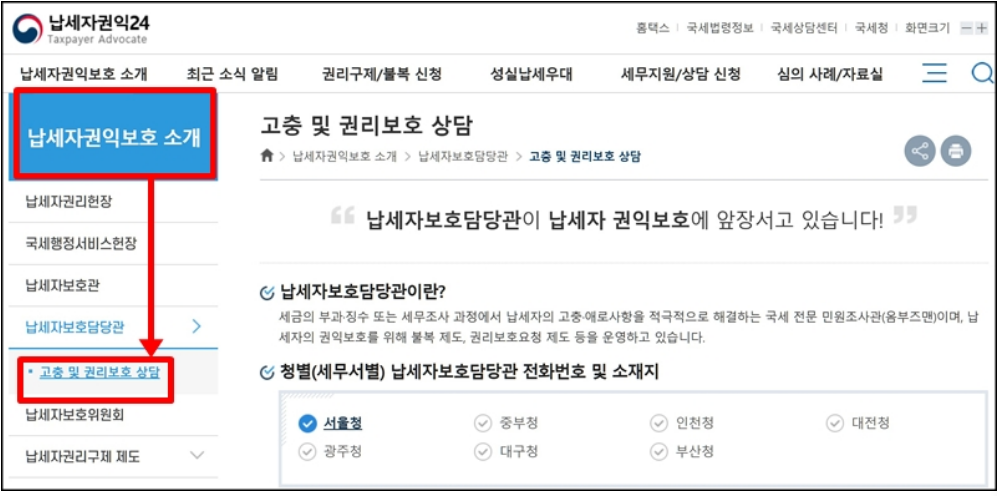 납세자 권익 24 누리집 납세자보호담당관 제도가 있습니다.
