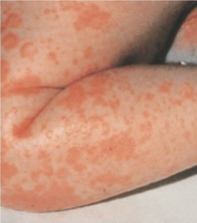 90%에서 볼 수 있습니다. 발진이 하루에 사라지기도 하고 1주일간 계속되기도 합니다. 물집이나 괴사딱지(부스럼딱지)는 형성되지 않습니다. 대부분이 홍반이라고 합니다.