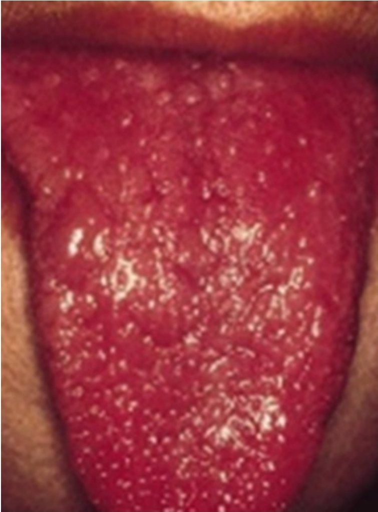 입술에는 홍조, 건조, 갈라짐, 출혈이 나타납니다. 구강에는 미만성 발적, 딸기혀가 나타납니다. 아프타(aphtha)나 궤양은 생기지 않습니다.