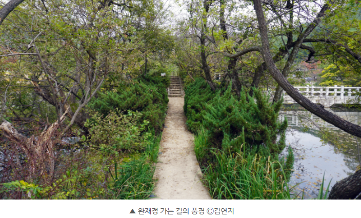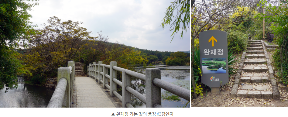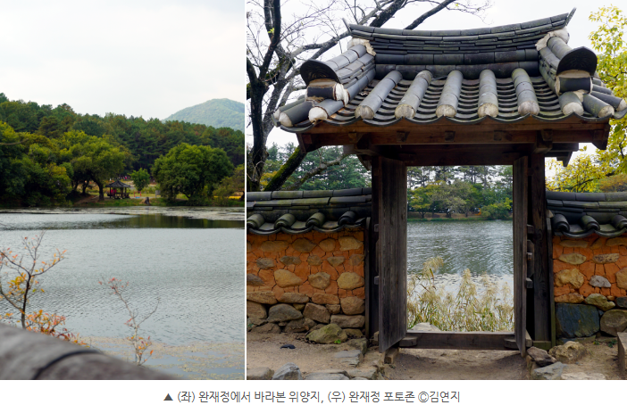 완재정에서 바라본 위양못 건너편의 풍경도 매우 아름답습니다. 마루 맞은편에는 협문 문턱에 있는데, 위양지를 배경으로 이곳에 앉아서 사진을 남기는 사람들이 많습니다.