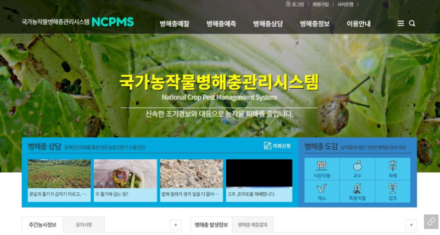무엇보다도 중요한 건 조기 예찰과 빠른 대처입니다. 이때 도움을 줄 수 있는 홈페이지가 있습니다. 바로 국가농작물병해충 관리시스템(NCPMS)입니다.