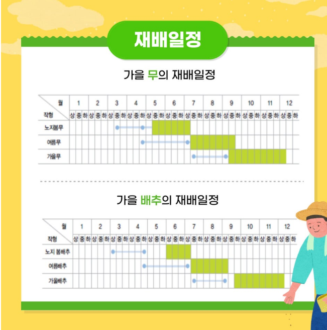 무와 배추는 봄, 여름, 가을 등 작기별로 재배 가능한 품종이 별도로 세분화되어 있어 알맞은 작기의 품종을 선택하는 것이 좋다고 합니다.