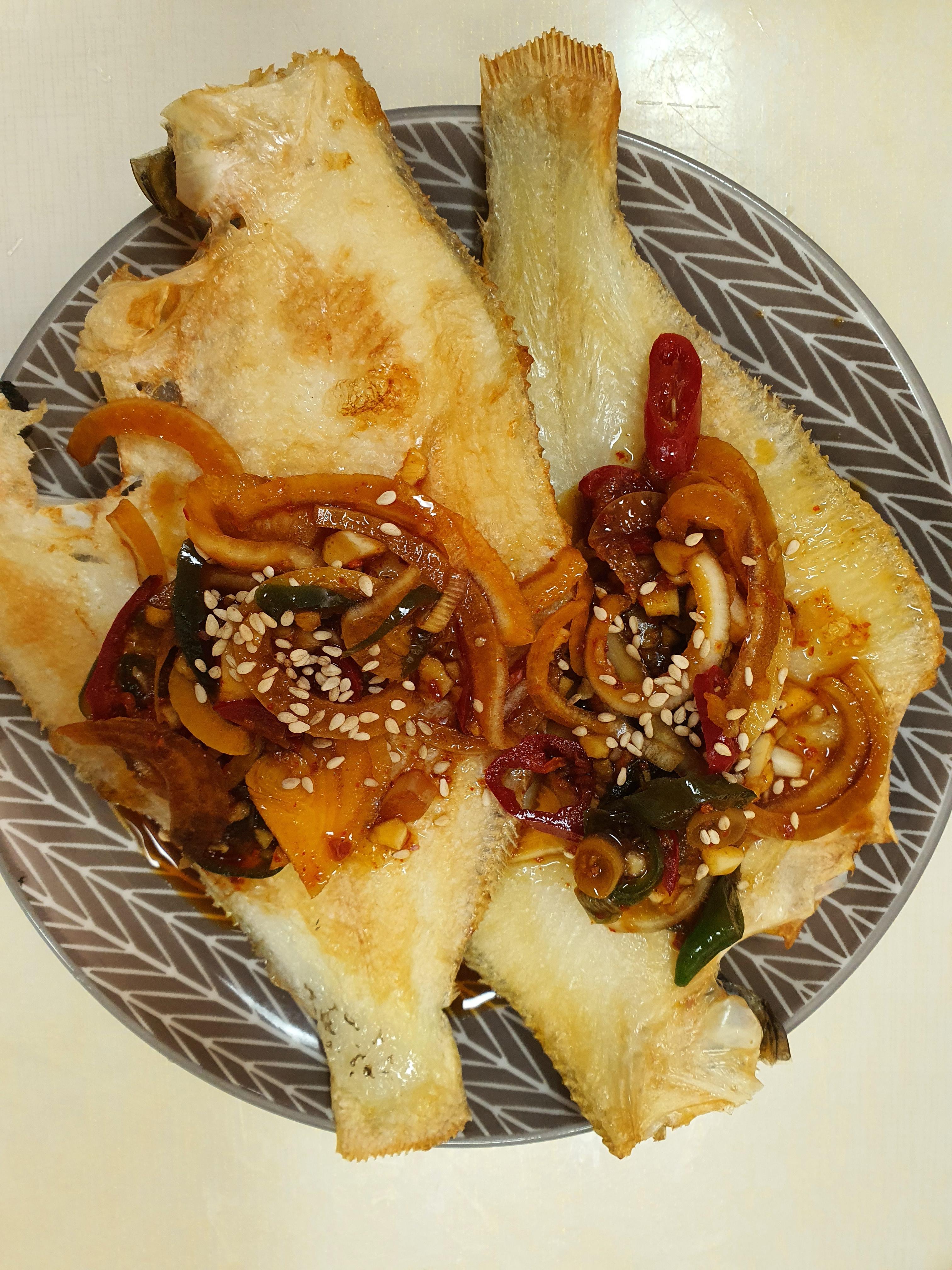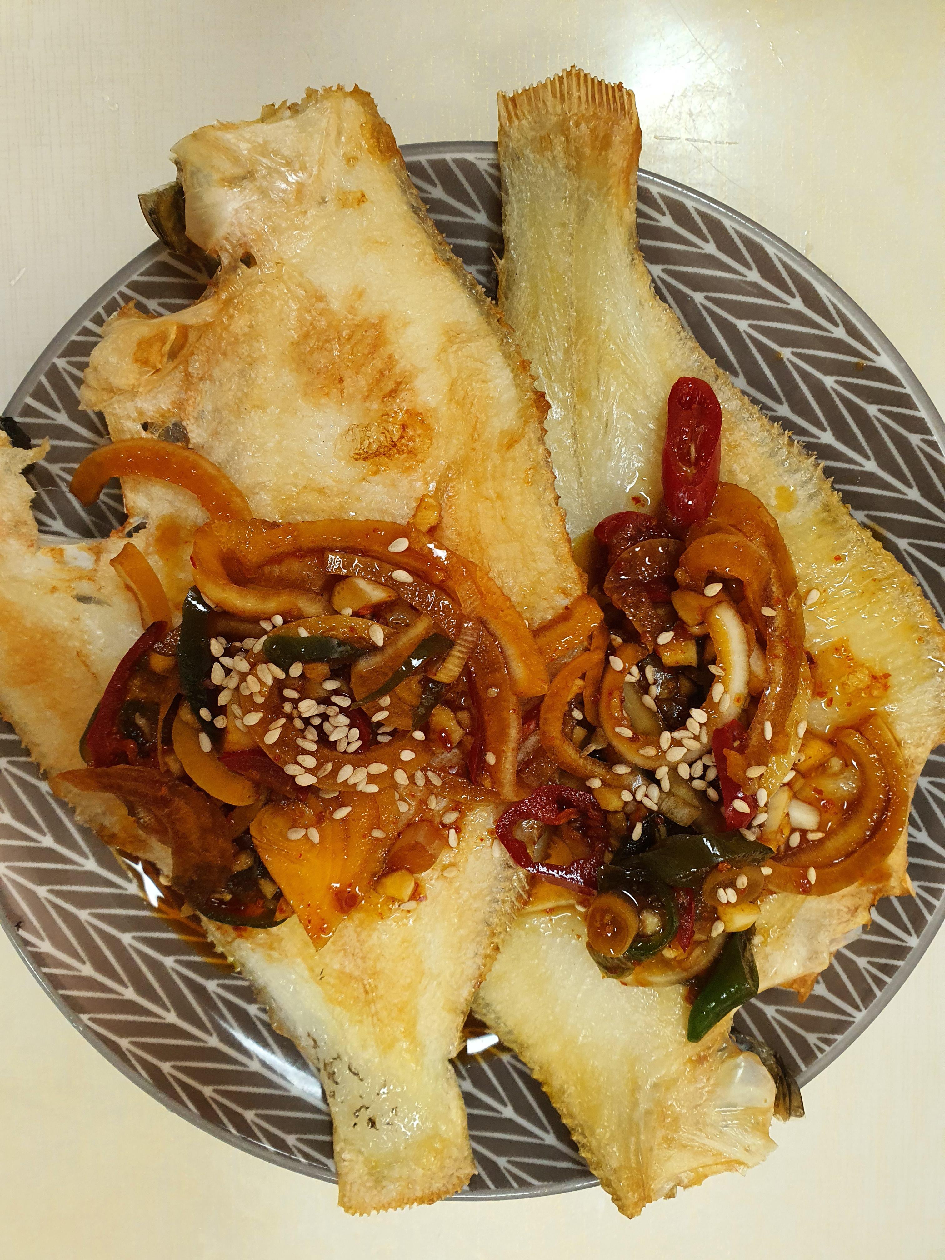3. 잘 쩌진 가자미를 예쁜 접시에 놓고 양념장을 뿌려줍니다.