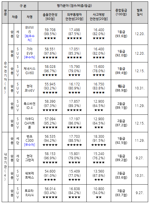 - 안전도평가 결과 BMW i5·벤츠 C300·기아 EV9 등 6개 차종 종합평가 1등급