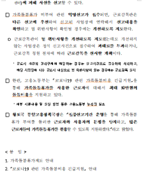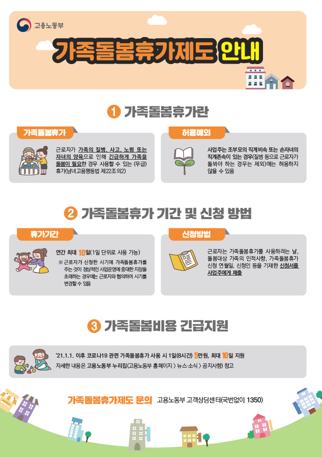 황보국 고용 통합고용정책국장은 "최근 수도권 거리두기 격상 등에 대응해 많은 근로자들이 경제적 부담을 덜고 가족돌봄휴가를 사용할 수 있도록 제도 안내와 지원에 최선을 다하겠다"고 밝혔다고 합니다.