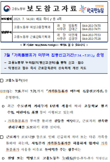고용노동부가 7월 14일부터 31일까지 '가족돌봄휴가 미부여 집중신고기간'을 운영한다고 밝혔다고 합니다.