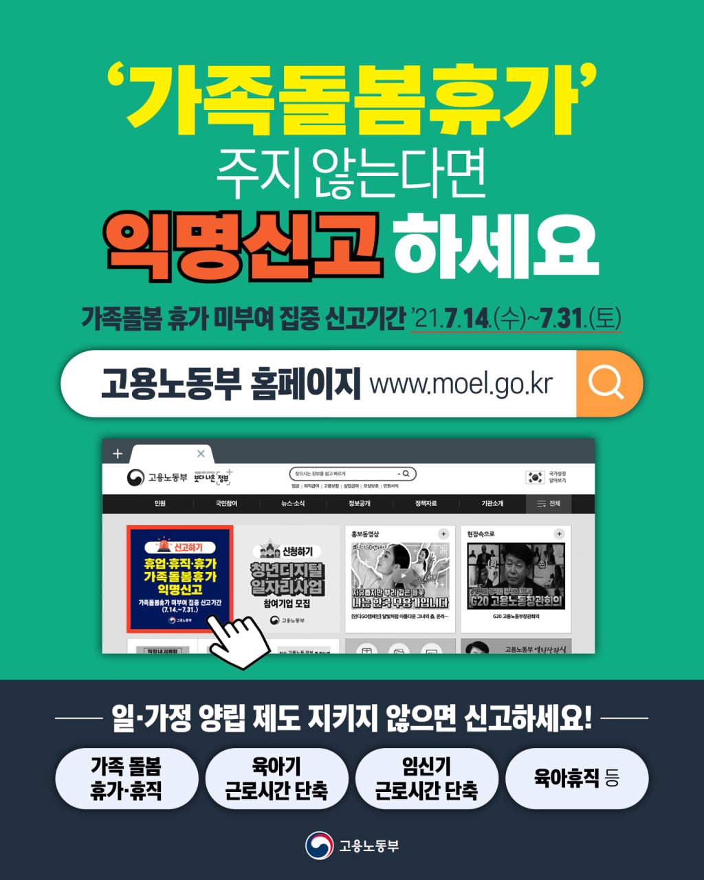 7월「가족돌봄휴가 미부여 집중신고기간(7.14.~7.31.)」운영 - 고용노동부 누리집(익명신고센터)을 통해 신...