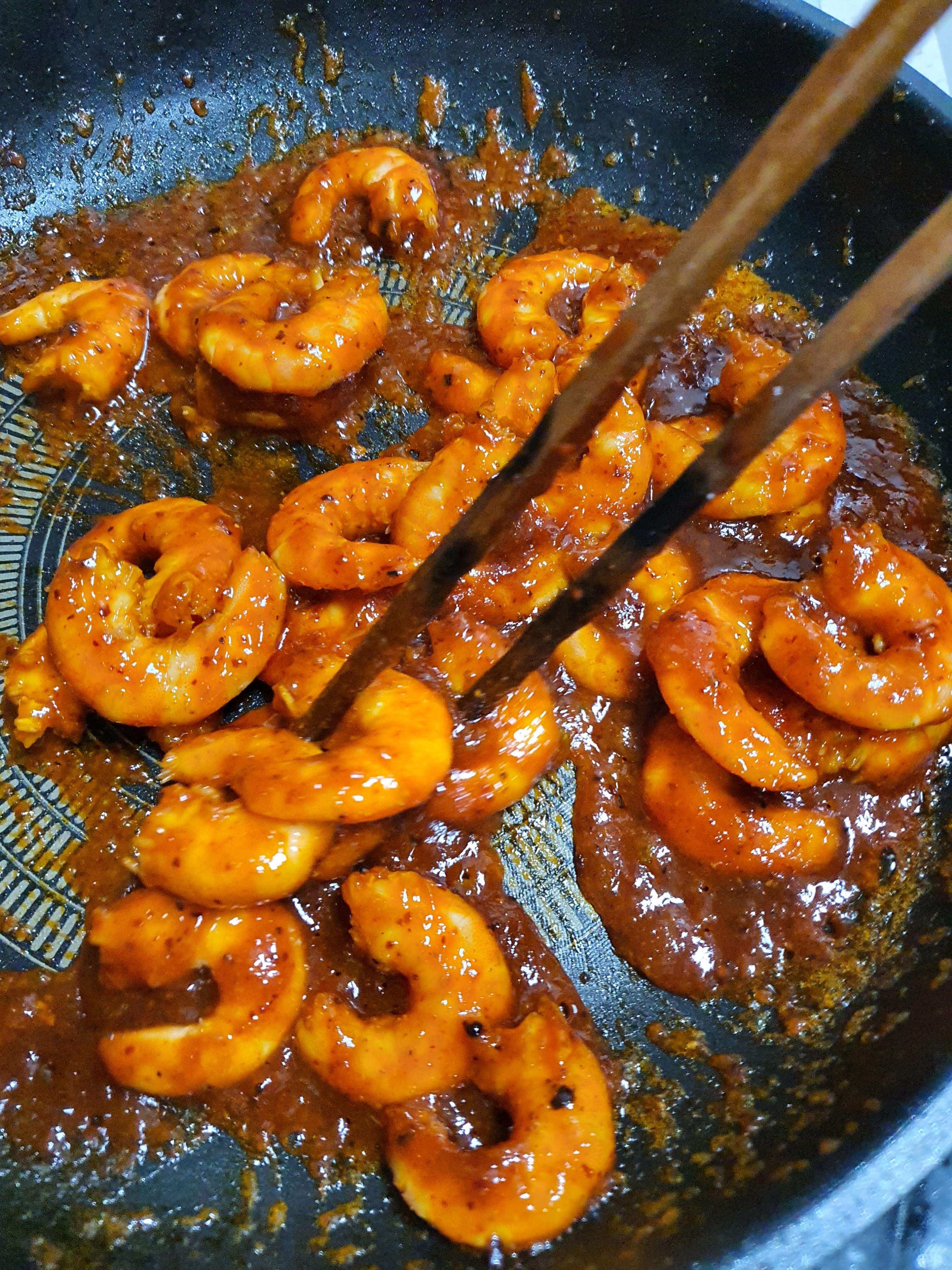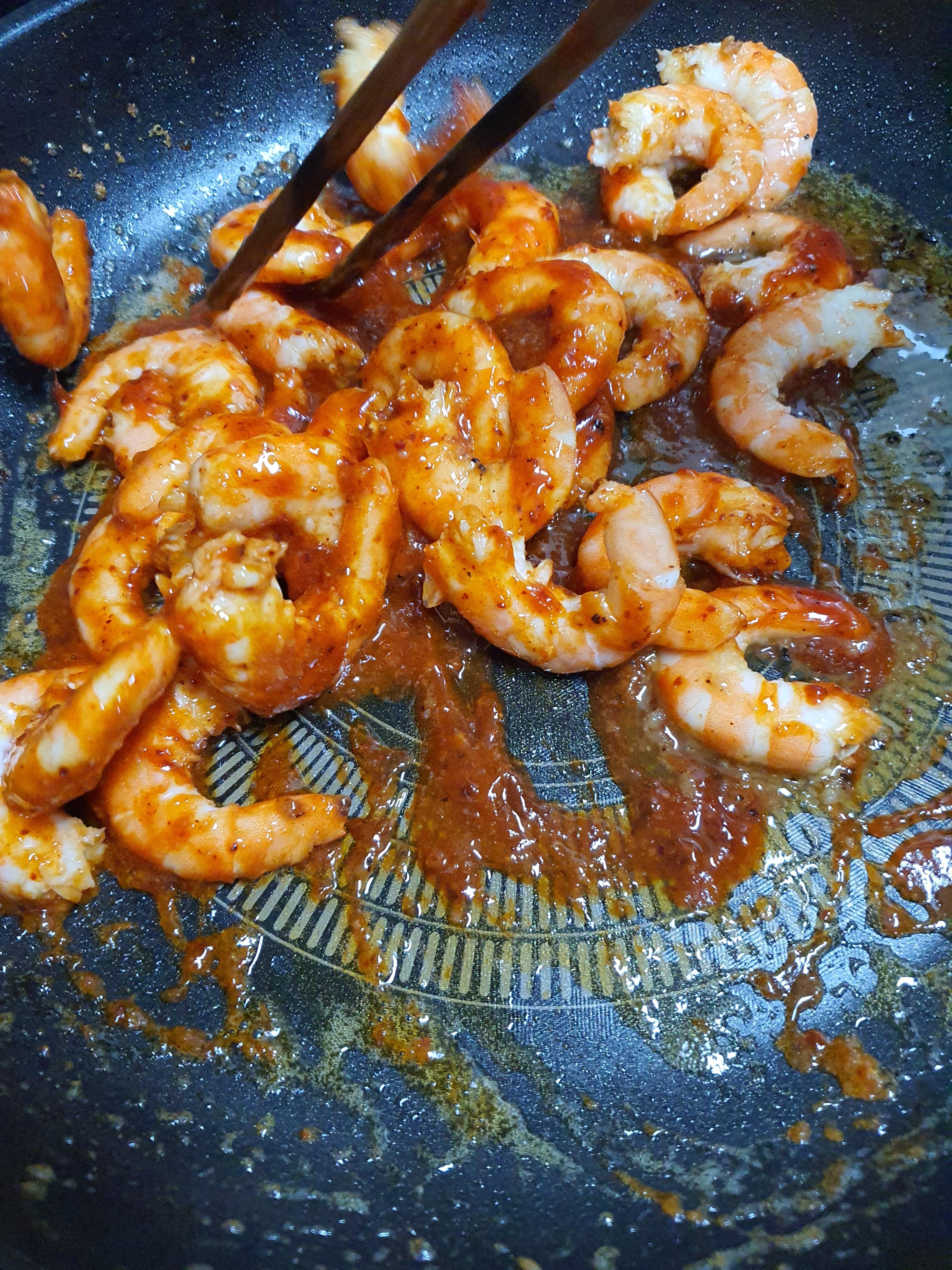 6. 볶아준 새우에 미리 만들어 놓은 양념장을 넣고 함께 쉐킷~ 쉐킷~ 5분정도 볶아주면 끝 ^^