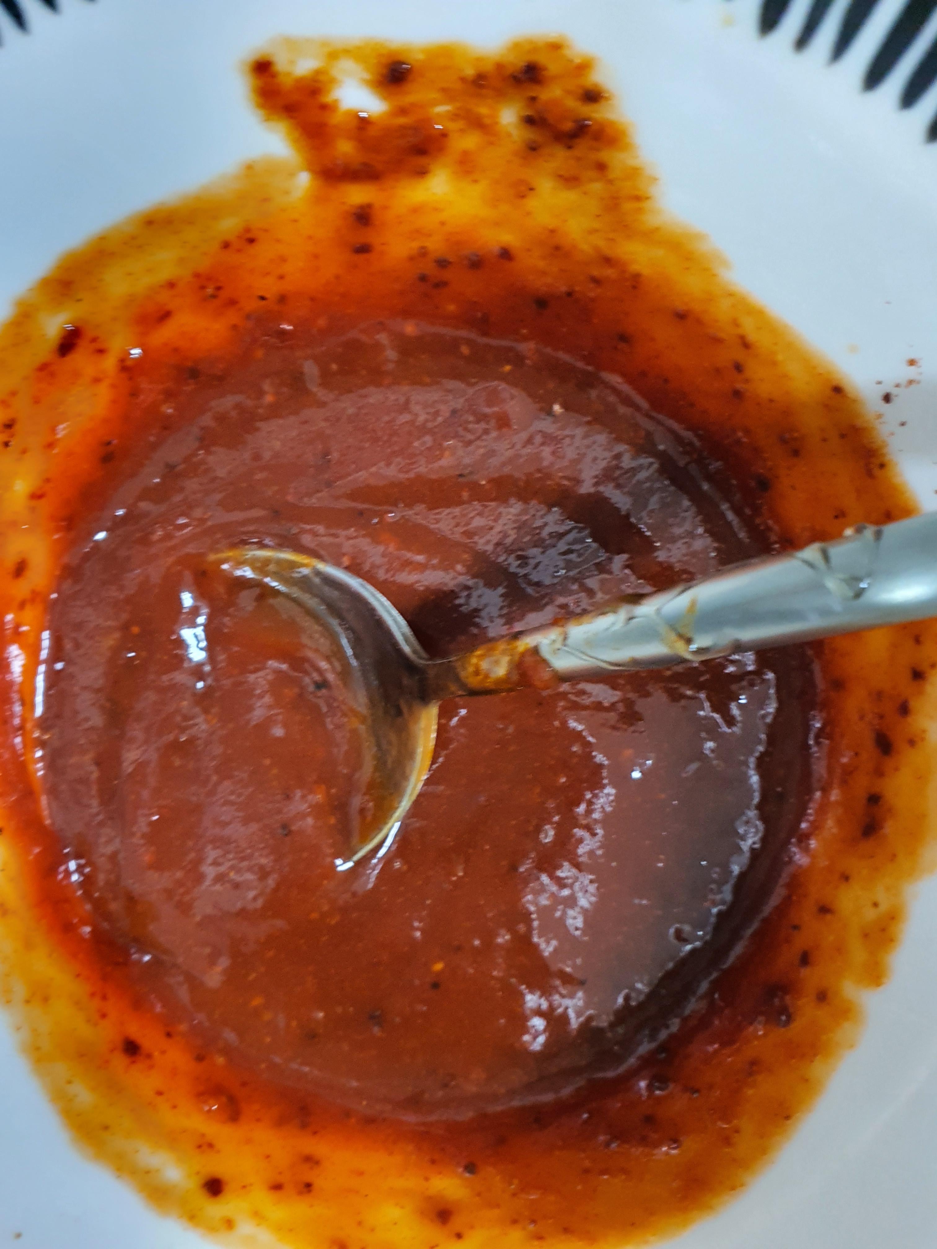고추장 반 스푼, 캡찹 3스푼, 고추가루 1스푼, 식초 1스푼, 간장 1스푼, 설탕 1스푼, 조청 1스푼을 섞어 둡니다.