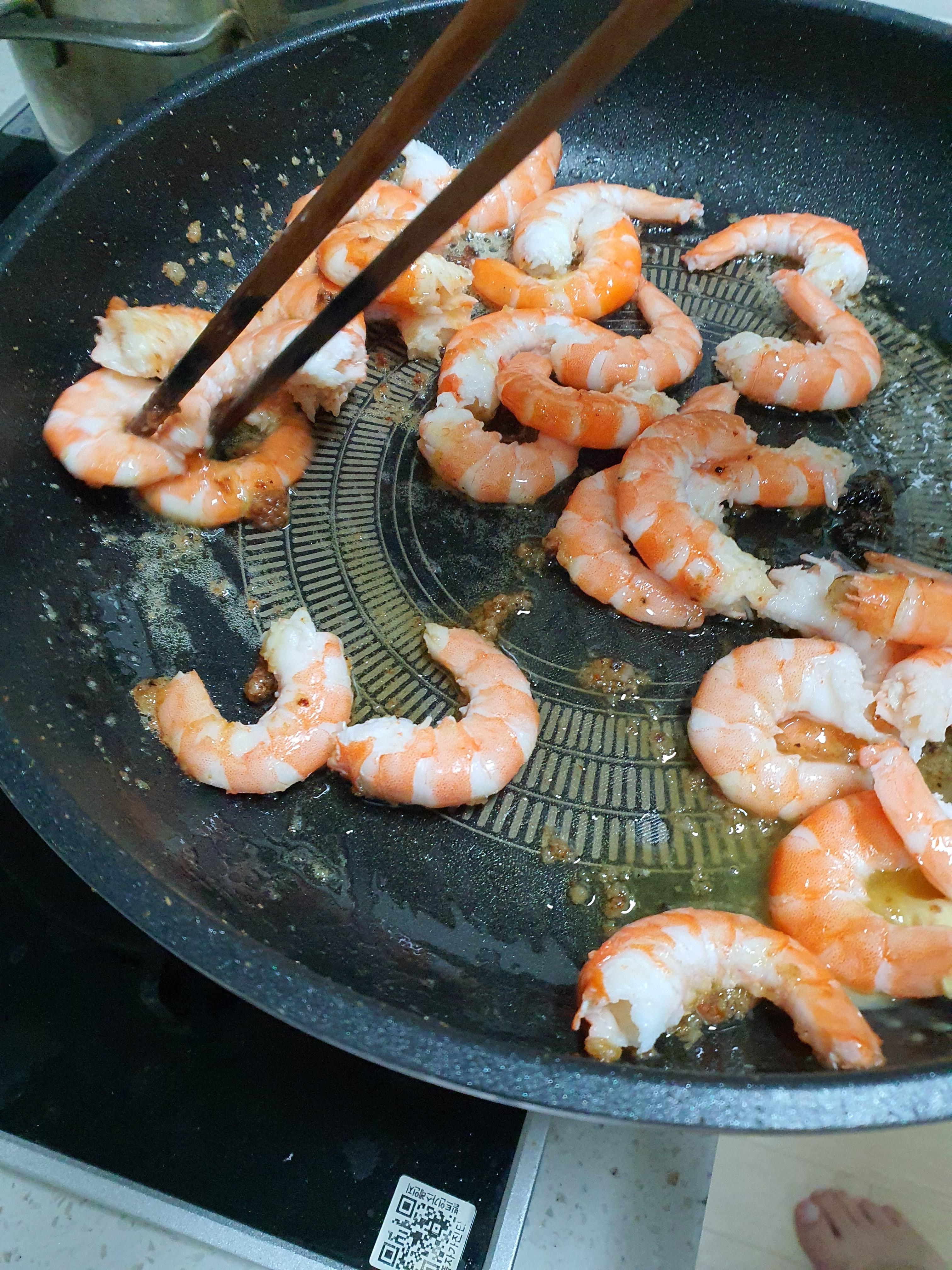 5. 버터가 다 녹으면 깐새우를 넣어 2~3분 같이 볶아줍니다.