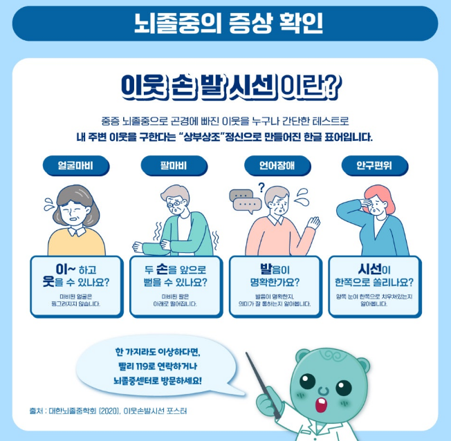 ✔ 경고 신호 : 갑자기 한쪽 얼굴·팔다리에 힘이 빠짐, 말이 어눌해짐
