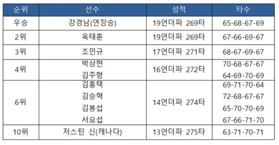 이번 대회 전까지 상금 순위 15위에 머물렀던 강경남은 우승 상금 1억 2000만원을 추가하며 누적 상금액 2억 5452만 6578원을 기록하며, 상금랭킹 5위로 도약을 했다고 합니다.