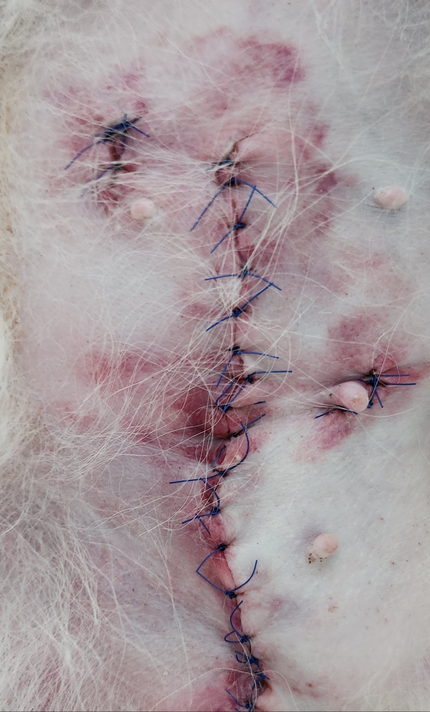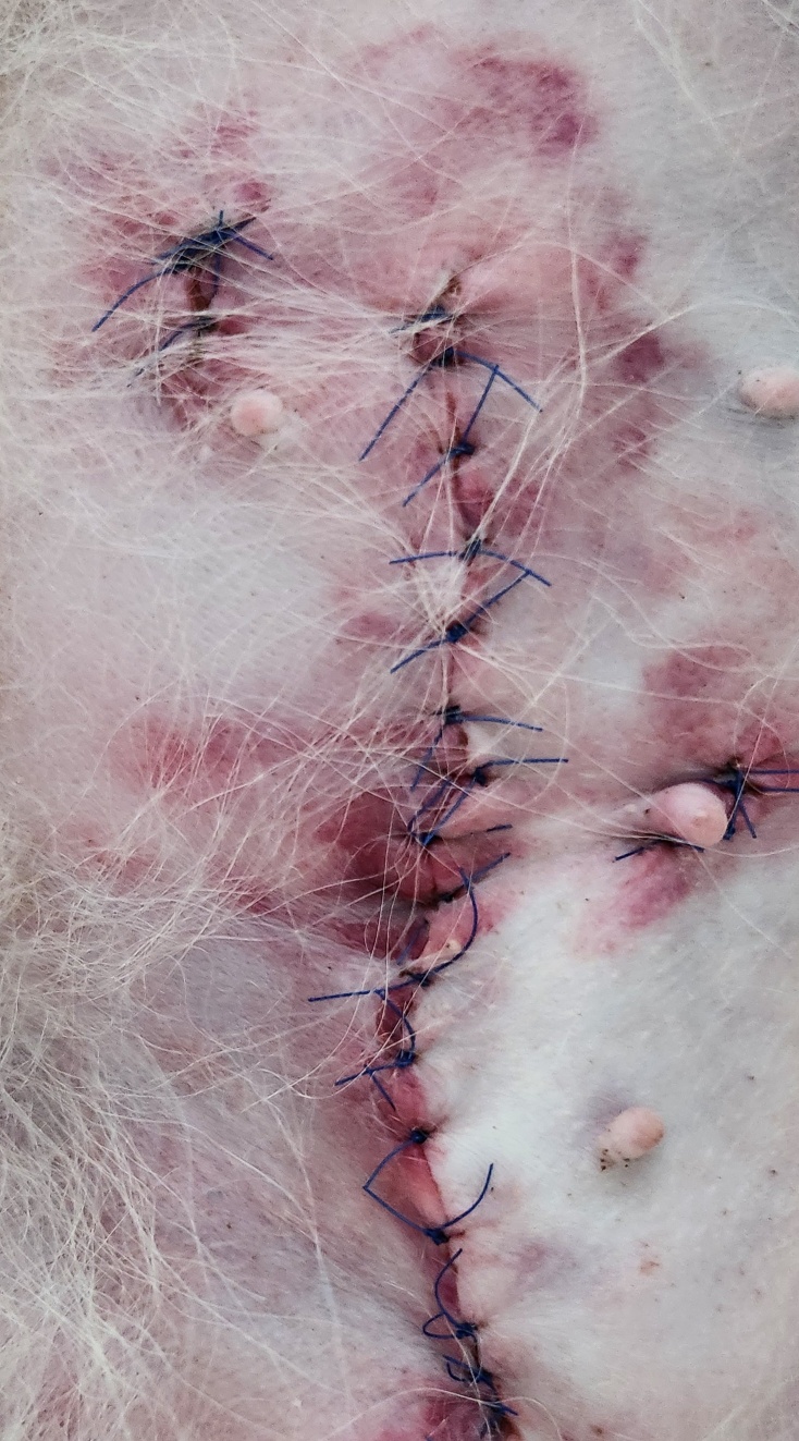 양 옆이 유선종양 수술 자국이고, 가운데 길게 난 자국이 자궁축농증 수술 자국입니다.