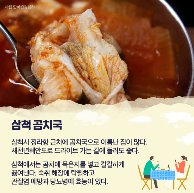 삼척에서는 곰치에 묵은지를 넣고 칼칼하게 끓여낸다고 합니다. 숙취 해장에 탁월하고 관절염 예방과 당뇨병에 효능이 있습니다.