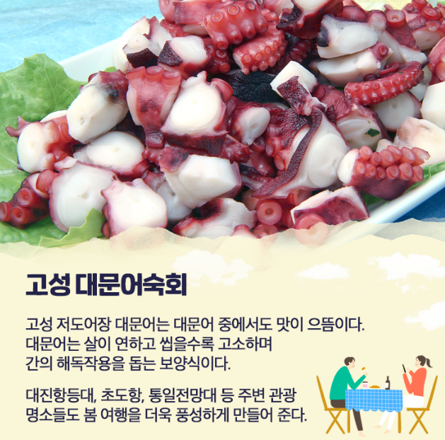 고성 저도어장 대문어는 대문어 중에서도 맛이 으뜸이라고 합니다. 대문 어는 살이 연하고 씹을수록 고소하며 간의 해독 작용을 돕는 보양식으로 소문났습니다.