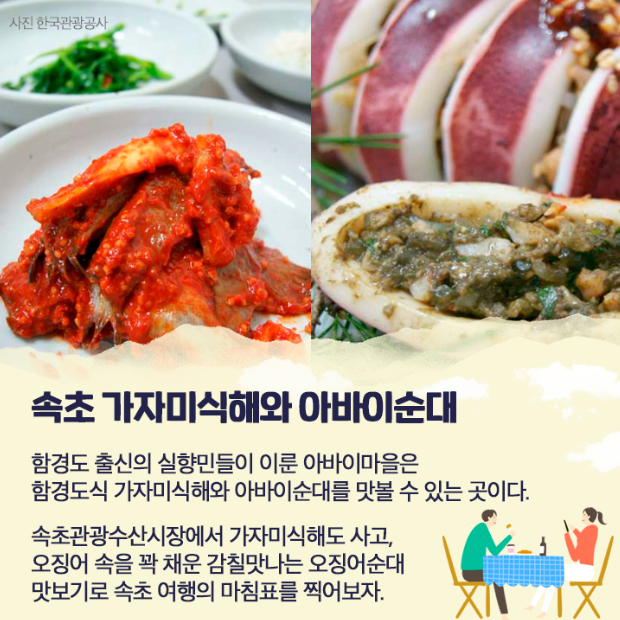 '속초관광수산시장'에서 가자미식혜도 사고, 오징어 속을 꽉 채운 감칠맛 나는 오징어순대도 맛보면 좋습니다.