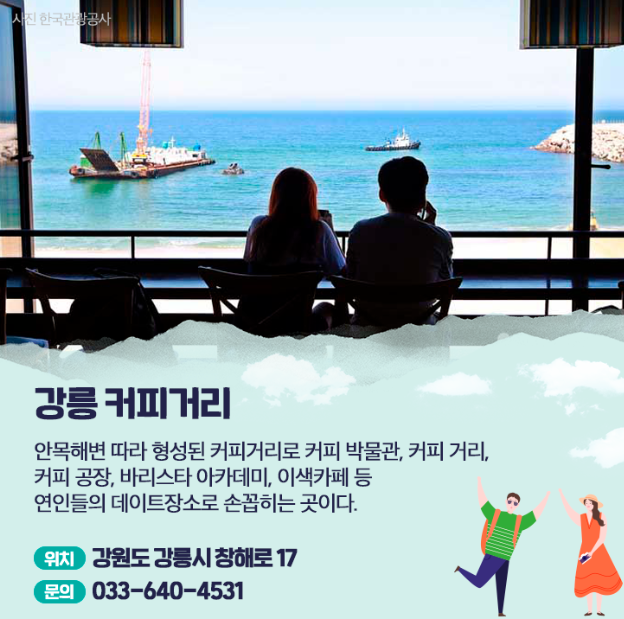 안목해변을 따라 형성된 커피 거리로 커피 박무관, 커피 거리, 바리스타 아카데미, 이색카페 등 연인들의 데이트 장소로 손꼽히는 곳