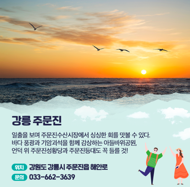 일출을 보며 주문진수산시장에서 싱싱한 회를 맛볼 수 있고 바다 풍경과 기암괴석을 함께 감상하는 아들바위공원, 언덕 위 주문진성황당과 주문진 등대도 꼭 들려야 할 곳