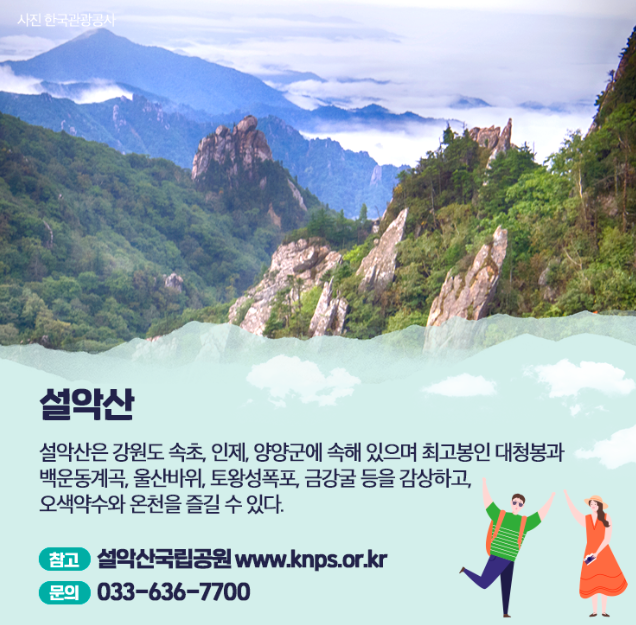 설악산은 강원도 속초, 인제, 양양군에 속해 있으며 최고봉인 대청봉과 백운동계곡, 울산바위, 토왕성폭포, 금강굴 등을 감상할 수 있고 오색약수와 온천을 즐길 수 있는 곳