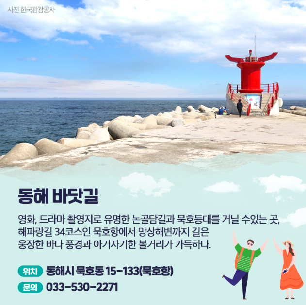 영화, 드라마 촬영지로 유명한 논골담길과 묵호등대를 거닐 수 있는 곳, 해파랑길 34코스인 묵호항에서 망상해변까지 길은 웅장한 바다 풍경과 아기자기한 볼거리가 가득~