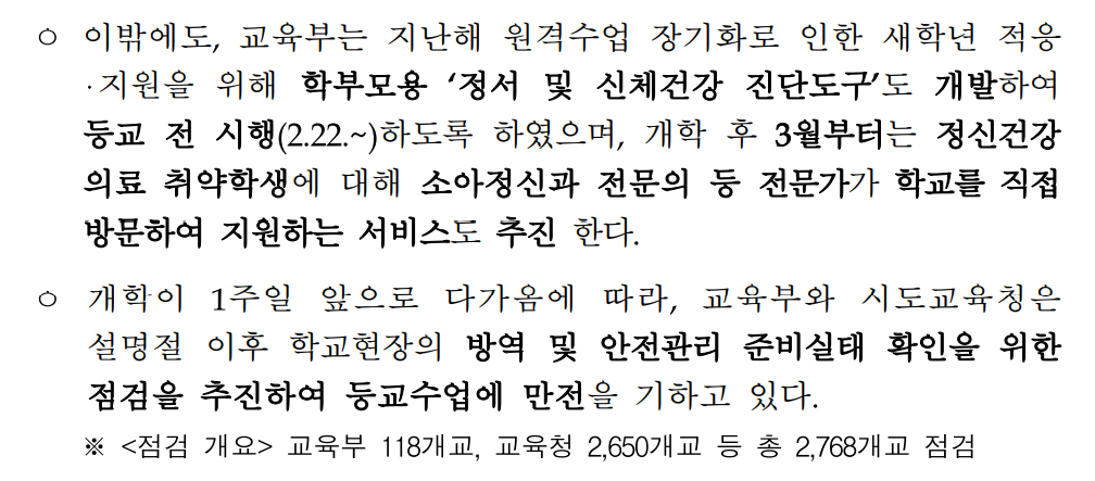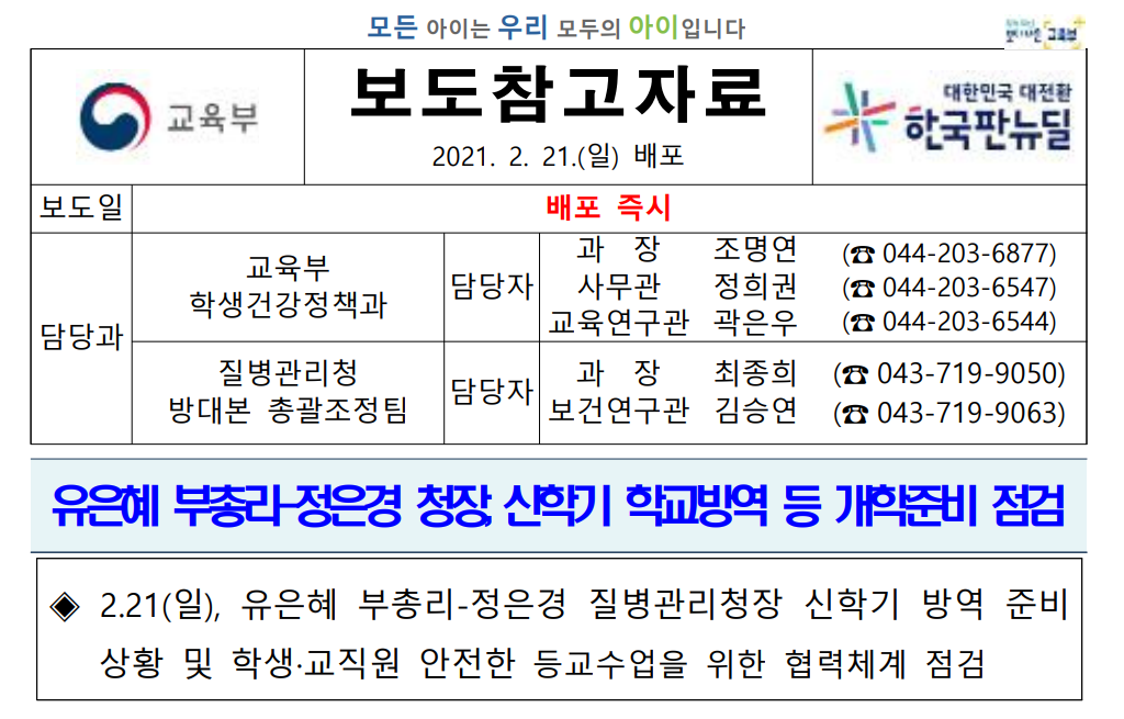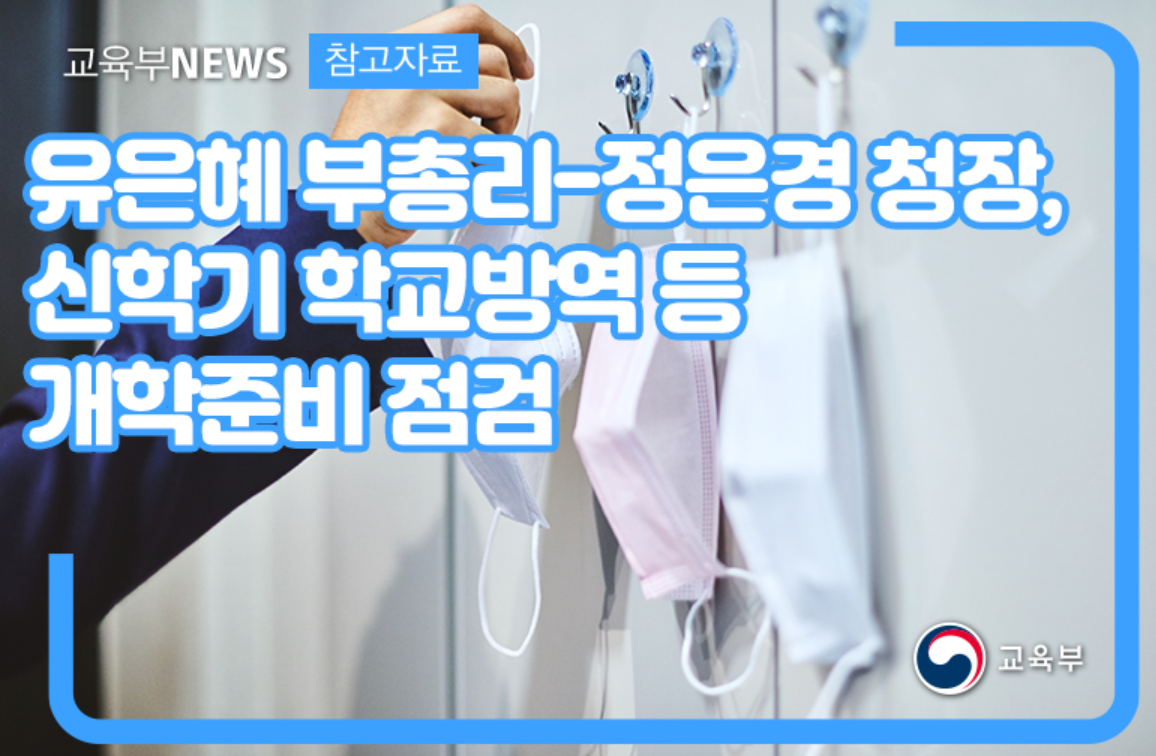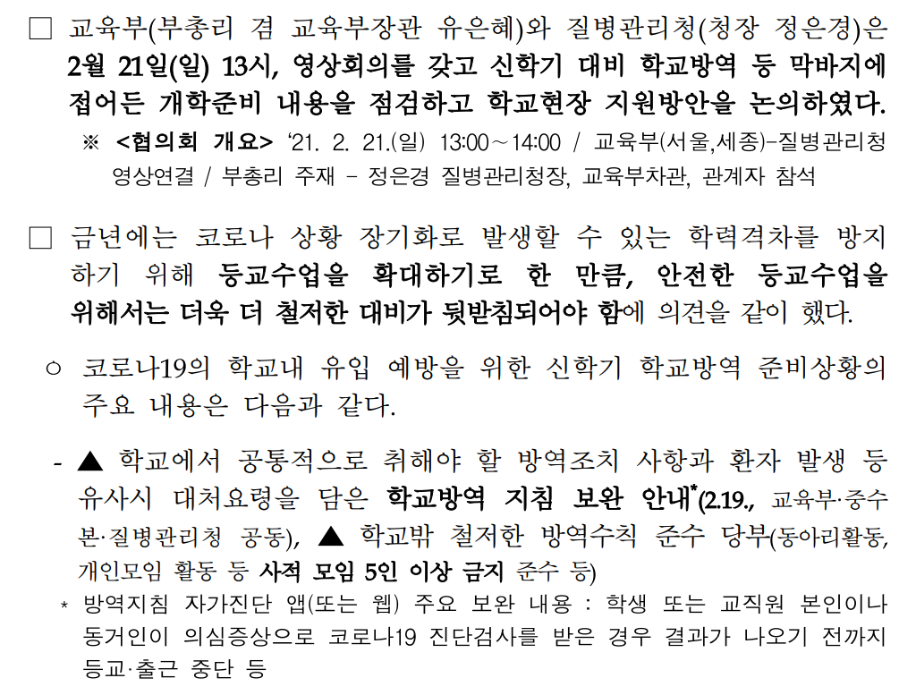 교육부(부총리 겸 교육부장관 유은혜)와 질병관리청(청장 정은경)은 2월 21일(일) 13시, 영상회의를 갖고 신학기 대비 학교방역 등 막바지에 접어든 개학준비 내용을 점검하고 학교현장 지원방안을 논의하였다고 합니다.