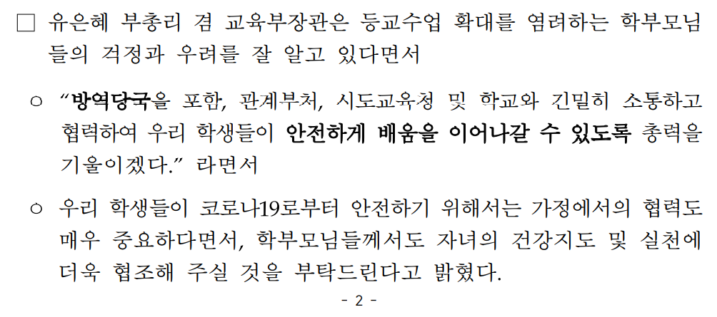 유은혜 부총리 겸 교육부장관은 등교수업 확대를 염려하는 학부모님들의 걱정과 우려를 잘 알고 있다면서 “방역당국을 포함, 관계부처, 시도교육청 및 학교와 긴밀히 소통하고 협력하여 우리 학생들이 안전하게 배움을 이어나갈 수 있도록 총력을 기울이겠다.” 라면서, 우리 학생들이 코로나19로부터 안전하기 위해서는 가정에서의 협력도 매우 중요하다면서, 학부모님들께서도 자녀의 건강지도 및 실천에 더욱 협조해 주실 것을 부탁드린다고 밝혔다고 합니다.