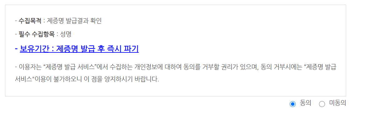 아래로 쭉 내려가면 발급하기 버튼을 클릭하면.. 회원정보 서비스 창이 보인답니다.