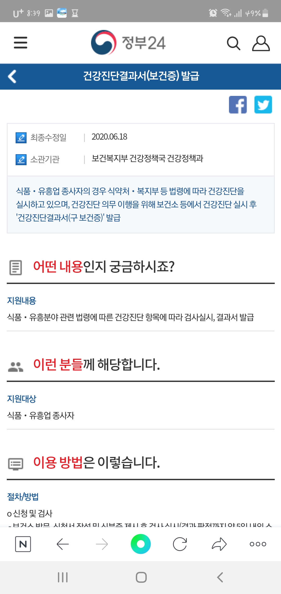 정부24에 들어가서 네 번째까지 창으로 이동하시면 건강진단결과(보건증)이 보입니다. 건강진단결과(보건증)을 클릭하시면..