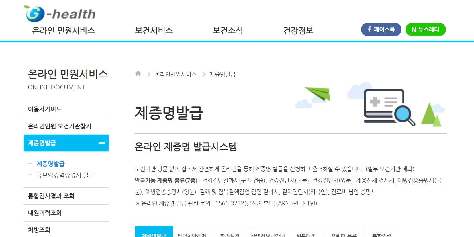 - 온라인 : 공공보건포털(g-health.kr) 접속 > 온라인 민원서비스 > 제증명발급 > 건강진단결과서(보건증) 클릭