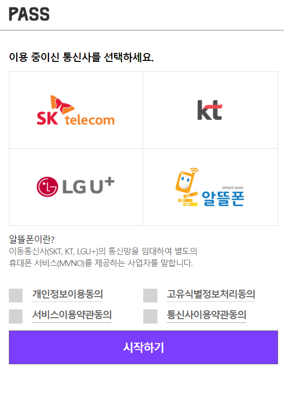 핸드폰본인확인 절차는 아래와 같이 통신사 선택과 동의란 체크하시고 시작하기 누르면..