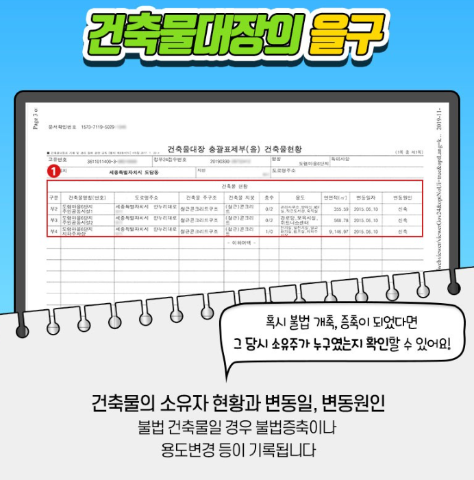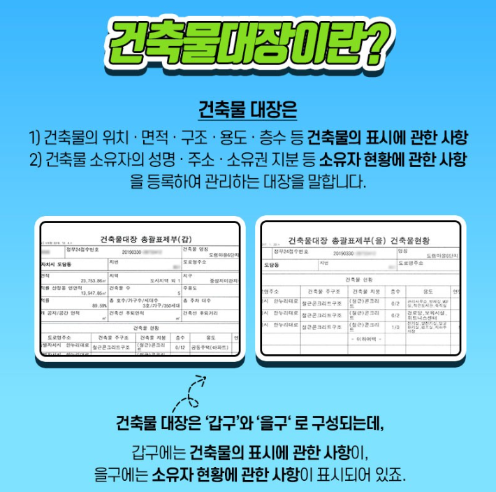 건축물 대장은 1) 건축물의 위치·면적·구조·용도·층수 등 건축물의 표시에 관한 사항, 2) 건축물 소유자의 성명·주소·소유권 지분 등 소유자 현황에 관한 사항을 등록하여 관리하는 대장을 말합니다.