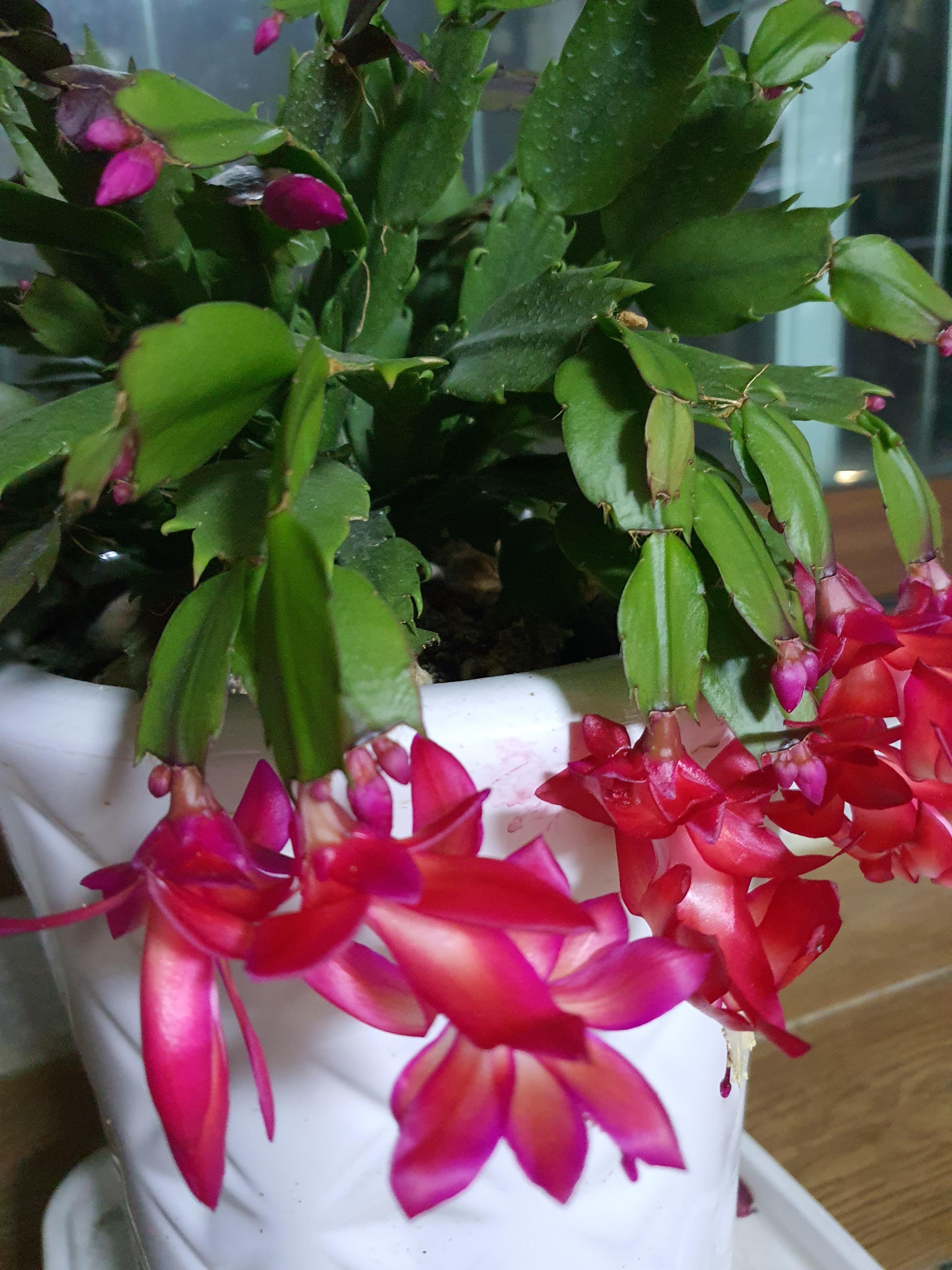 가재발선인장은 성탄절에 꽃이 피기 때문에 크리스마스캑터리라는 별명도 있다고 합니다. 게발선인장에 비해 다소 일찍 피고, 꽃의 길이가 좀 길며, 층상구조를 하고 있습니다.