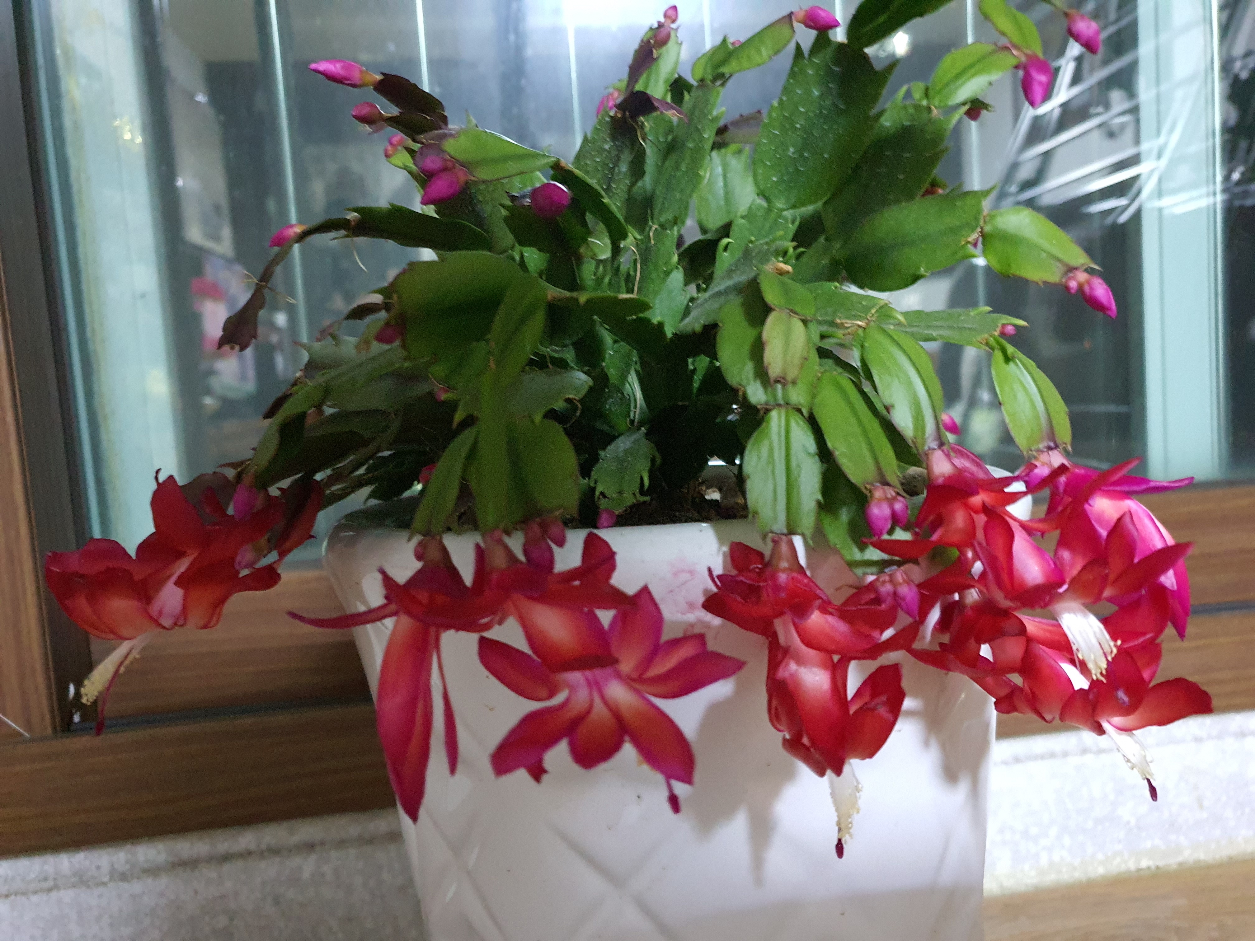 가재발선인장 꽃을 많이 볼려면 겨울철 잠을 잘 잘 수 있게 밤을 길게 만들어줘야 하기 때문에 태양이 지고 어두워지면 인공광이 들어가지 않는 곳에 두거나 박스로 덮어줍니다.