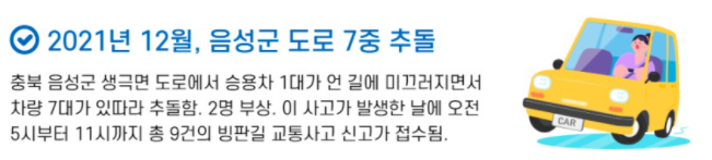충북 음성군 생극면 도로에서 승용차 1대가 언 길에 미끄러지면서 차량 7대가 잇달아 추돌한 사례라고 합니다. 길이 좁은 일반 도로로 후속 차들이 피해가기가 굉장히 어려웠고, 출근 시간대에 발생한 사고인 것을 보면 주행속도가 평소보다 빨라 사고를 면하기 쉽지 않았을 것이라고 합니다.