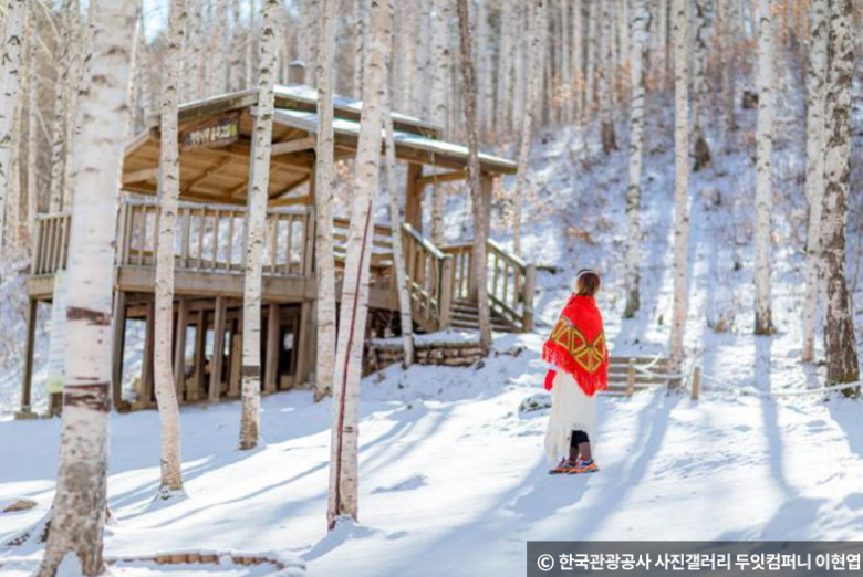 속삭이는자작나무숲은 산림청이 올해 선정한 '대한민국 100대 명풍 숲' 중 하나입니다. 수령 20년 이상 되는 자작나무 69만 그루가 숲을 빼곡히 채우고 있습니다. 흰 수피를 가진 자작나무는 주위 풍경과 잘 어우러져 시비하고 이국적인 분위기를 풍깁니다. 속삭이는자작나무숲 초입에 있는 나무 움집은 이곳의 대표 포토존입니다. 사람이 몰릴 땐 줄을 서서 기다리기보다 탐방로를 따라 더 깊은 숲 속으로 들어가는 것을 추천합니다. 총 7개의 탐방 코스가 있을 만큼 숲 규모가 커서 한층 울창하고 고요한 풍경을 만날 수 있습니다.