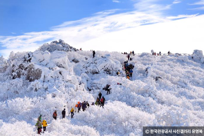 무주 덕유산은 우리나라 겨울 여행지 하면 빼놓을 수 없는 대표적인 설산 명소입니다. 덕유산 리조트에서 곤돌라를 타면 해발 1,500m 설천봉까지 올라갈 수 있어 등산 초보도 어렵지 않게 설산을 만날 수 있습니다. 곤돌라를 타는 시간은 약 20분 정도이며, 설천봉에서 정상까지는 약 600m가량 도보로 이동해야 합니다. 설천봉엣 덕유산 정상인 항적봉으로 가는 길은 아름다운 상고대로 가득합니다. 주목, 구상나무, 철쭉나무 등에 핀 눈꽃은 추위도 잊게 할 만큼 절경을 자랑합니다. 카메라 필터의 힘을 빌리지 않아도 만족스러운 사진을 남길 수 있습니다.