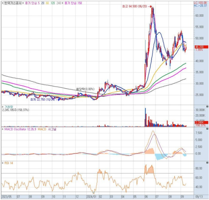한국가스공사는 올해 6월에 100% 이상의 주가 상승을 보였고 현재는 조정 중에 있는 모습입니다.