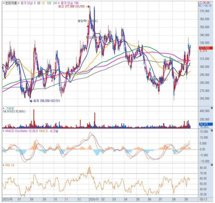 | 3 | 한미약품 | 41,444억 | O(안정) | 장기횡보추세/단기상승추세 (이동편균선 미집) |