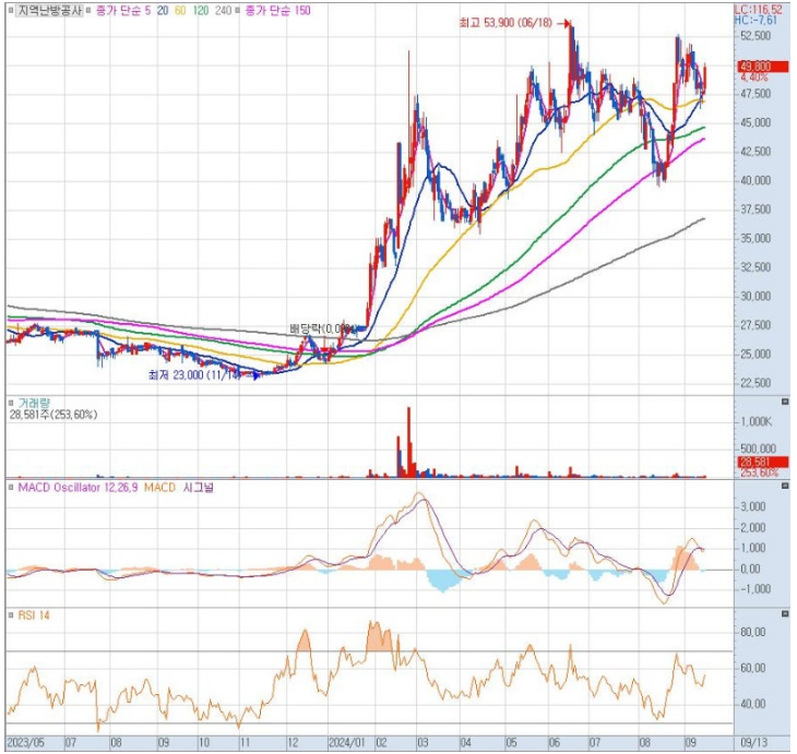 지역난방공사 일봉차트입니다. 이미 꽤나 많이 상승한 모습을 보이고 있는 데다 50,000원 가격대에서 장시간 저항에 부딪히고 있는 모습입니다. 신규 매수 포인트를 잡기에는 조금 애매한 위치라는 생각이 듭니다.