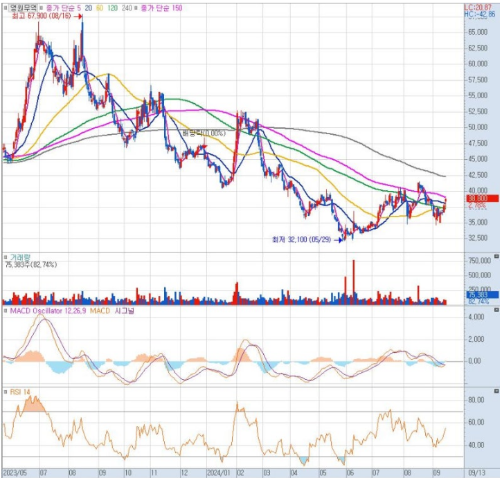 의류 판매로 인해 겨울테마로 묶여있는 영원무역입니다. 23년 중순부터 지속적으로 주가는 하락했습니다. 이제 바닥을 잡아가는 모습인지 알 순 없지만 하락 추세를 끝마치려는 움직임으로 보여집니다.