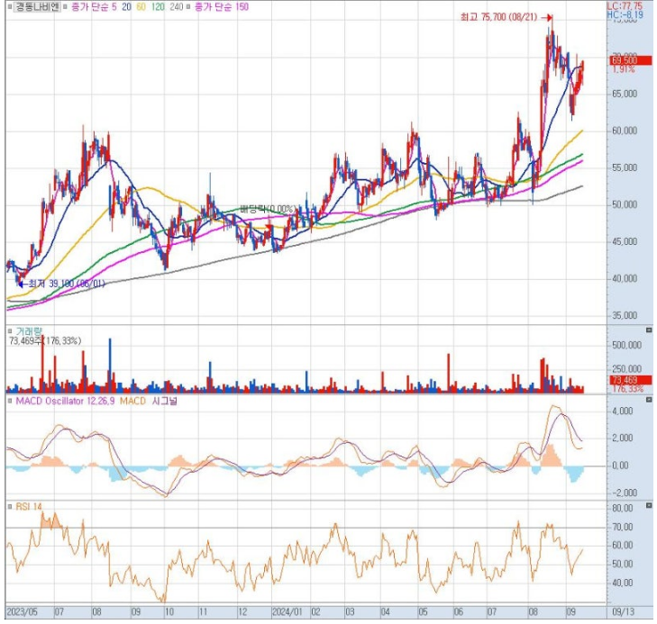 | 5 | 경동나비엔 | 10,125억 | O(안정) | 장기 상승추세/단기 조정증? (52주 신고가, 단기 약한 조정중) |