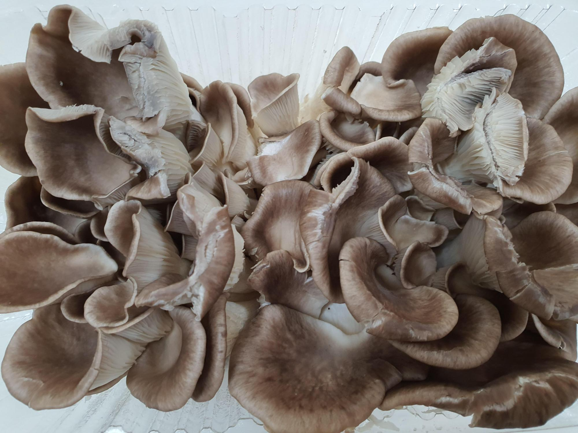 균모가 느타리에 비해서 얇고 가장자리가 더 날카롭습니다. 살은 흰색이며 연합니다. 주름살은 내린 주름살로 밀생하며 흰색에서 연한 황토색-흰색으로 됩니다. 자루의 길이는 매우 짧거나 없습니다.