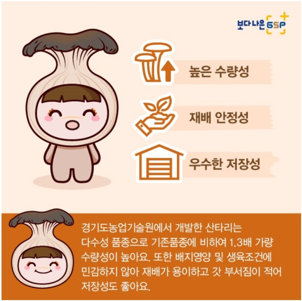 경기도 농업기술원 개발한 산타리는 다수성 품종으로 기존 풍종에 비하여 1.3배가량 수량성이 높을 뿐만 아니라 배지영양 및 생육 조건에 민감하지 않아 재배개 용이하고 갓 부서짐이 적어 저장성도 좋다고 합니다.