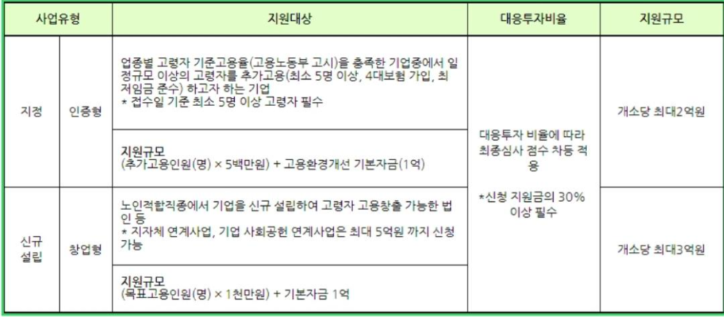 사업유형과 지원대상은 위의 표와같이 인증형과 창업형으로 구분이 됩니다. 인증형은 접수일 기준 최소 5명 이상의 고령자를 고용하고 있고, 업종별 고령자 기준 고용률을 충족한 기업 중에서 일정 규모 이상의 고령자를 추가 고용하는 기업을 고령자친화기업으로 지정하는 유형이라고 합니다. 또, 창업형은 노인적합직종에서 다수의 고령자를 고용하기 위해 신규로 설립한 기업을 고령자친화기업으로 지정하는 유형이라고 합니다.