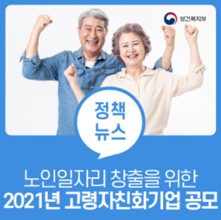 보건복지부는 급속한 고령화에 대비해 어르신들에게 안정적이고 질 높은 민간 일자리를 제공하고자 2021년 '고령자친화기업' 공모를 시작한다고 합니다.