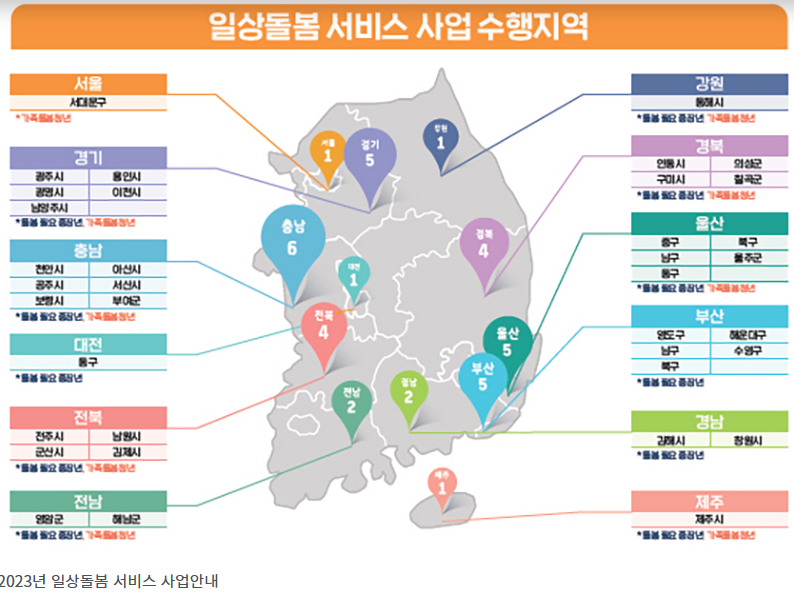 한편 정부는 일상돌봄 서비스 제공을 위한 사업계획을 마련하고 지난 6월 13일까지 전국 단위 공모를 통해 서울 서대문구, 부산 영동구, 대전 동구 등 12개 시·도의 37개 시군구를 사업 수행지역으로 1찬 선정했습니다.