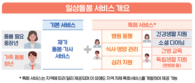 정부가 올해 하반기부터 질병과 고립 등으로 돌봄이 필요한 중장년(만40~64세)과 가족돌봄 청년(만 13~34세)에게 일상돌봄 서비스 지원한다고 합니다.