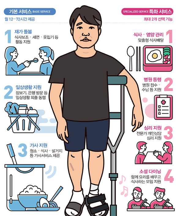 이에 재가 돌봄과 가사 서비스를 기본으로, 병원동행과 식사 및 영양관리, 심리지원, 건강생활 지원, 간병 교육 등 지역 자체별로 특화된 서비스를 개발·제공할 계획이라고 합니다.